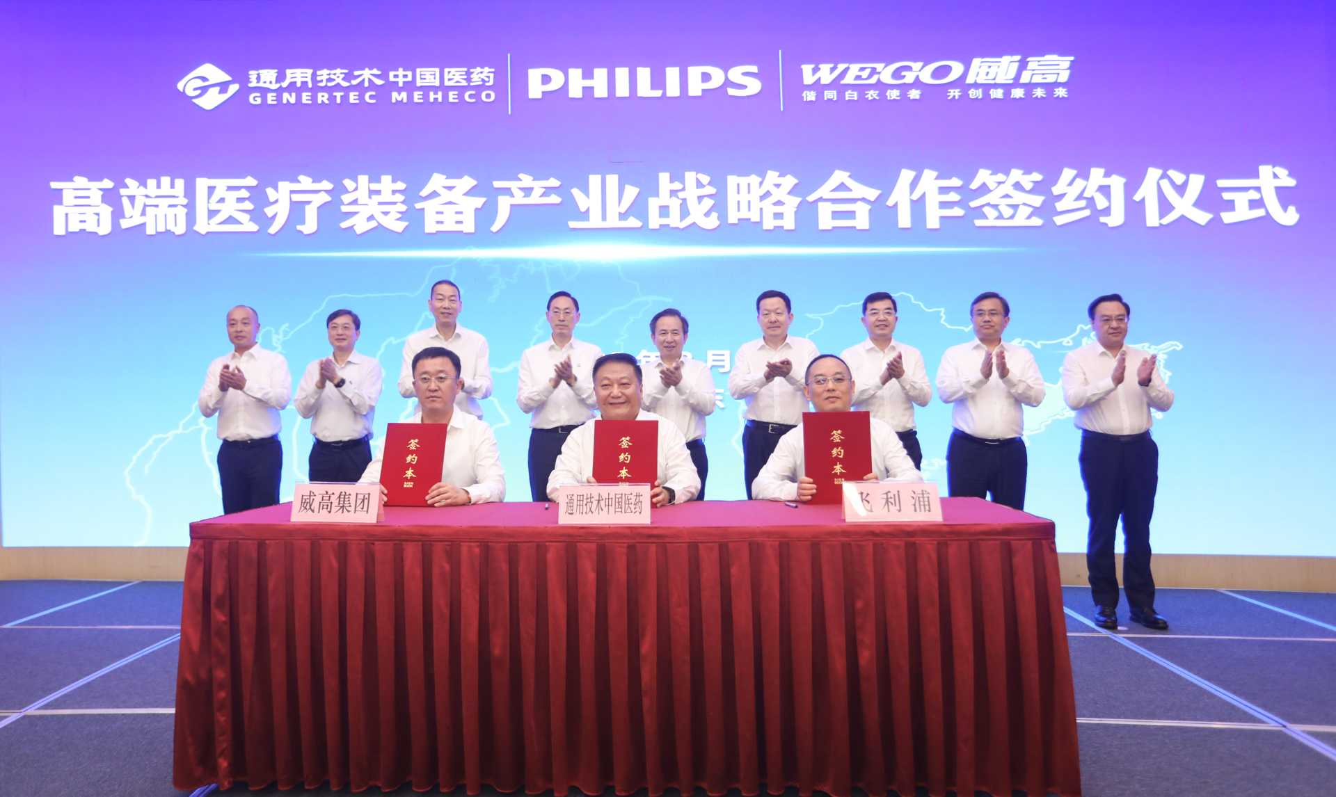 2022年8月30日,山东大厦——今日,飞利浦(中国)投资有限公司与通用技术中国医药、威高集团联合签署了“高端医疗装备产业战略合作协议”。 山东省委书记李干杰、省长周乃翔,通用技术集团党组书记、董事长于旭波,威高集团董事长陈林及飞利浦全球执委会委员、大中华区总裁何国伟,威海市委书记闫剑波、市长孔凡萍出席签约仪式。
