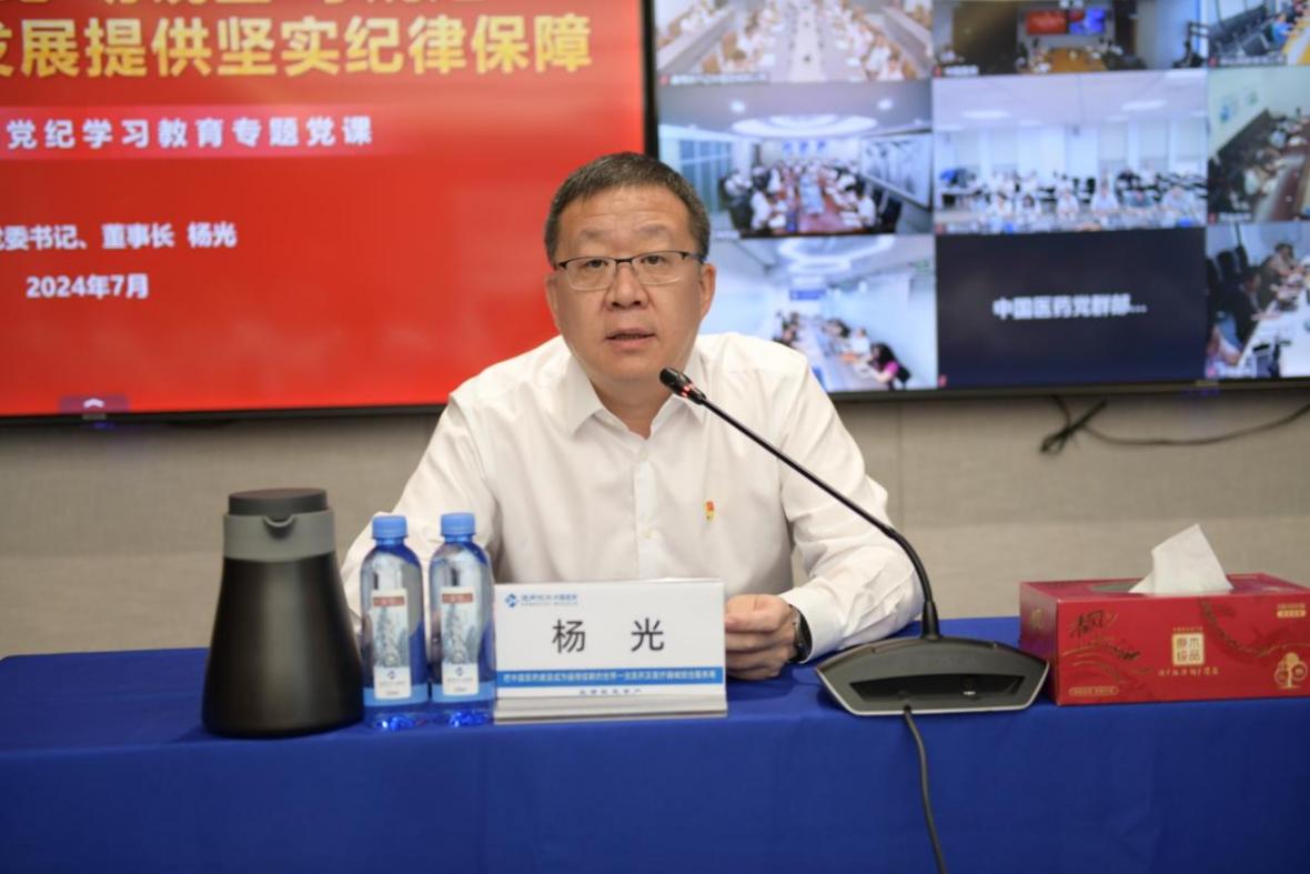 7月3日,通用技术中国医药举办学习贯彻习近平新时代中国特色社会主义思想暨党纪学习教育读书班,公司党委书记、董事长杨光以“学思想、知党纪、明镜鉴、守规矩,为公司高质量发展提供坚强纪律保障”为题讲授党纪学习教育专题党课,强调要深入学习贯彻习近平总书记关于党的自我革命的重要思想、关于全面加强党的纪律建设的重要论述,切实履行好新时代新征程上承担的职责使命,层层压实责任、坚持严的基调、营造好的氛围,以严明的纪律推动中央巡视整改取得实效,保障公司高质量发展。